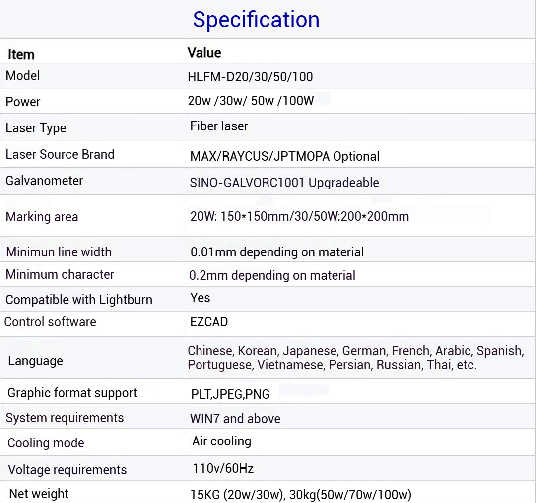 Parameters: 20W/30W/50W/100W, Graphic Format PLT PNG JPEG , voltage 110/220V,50/60hz, EzCad system, USB interface, 20W working area 150*150mm, 30W working area 200*200mm,50w and 100w working area 300*300mm.