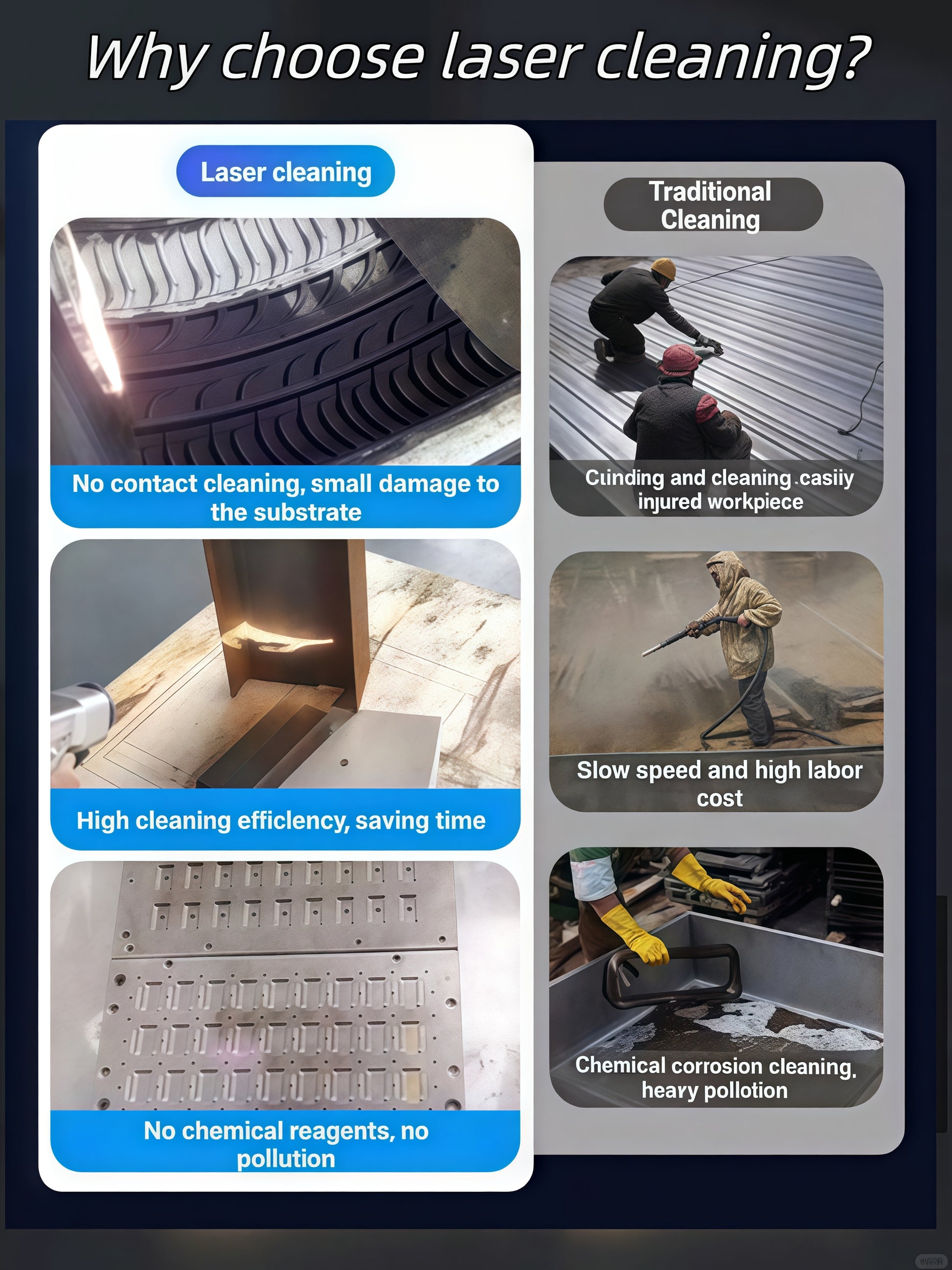 Application: Removal of metal surface rust, graffiti removal, surface matting and descaling, surface stains, debris, weld pretreatment, cultural relic cleaning and restoration. Shipbuilding, automotive parts, rubber molds, high-end machine tools, rail transportation, environmental protection