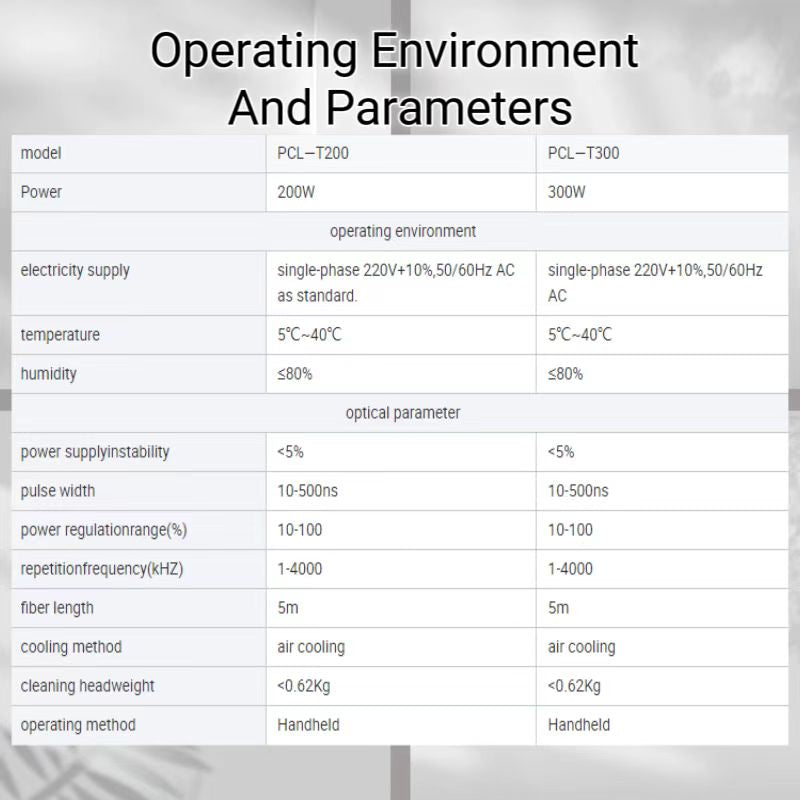 Product parameters: 200W,300W , pulse width: 10-500ns,electricity supply:single-phase 220V+10%,50/60Hz AC as standard,Working temperature:5℃~40℃,power regulationrange(%):10-100,repetitionfrequency(kHZ):1-4000,cooling method:air cooling,cleaning headweight:<0.62Kg.